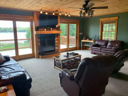 The Main house has a great room which offers a large open floor plan with the living and dining rooms in one area. There is a center stone fireplace and sliding doors from the living room which provide access to the deck facing the lake. A fully equipped kitchen with stainless steel appliances, center island and a connecting large dining area with 3 tables for plenty of seating.